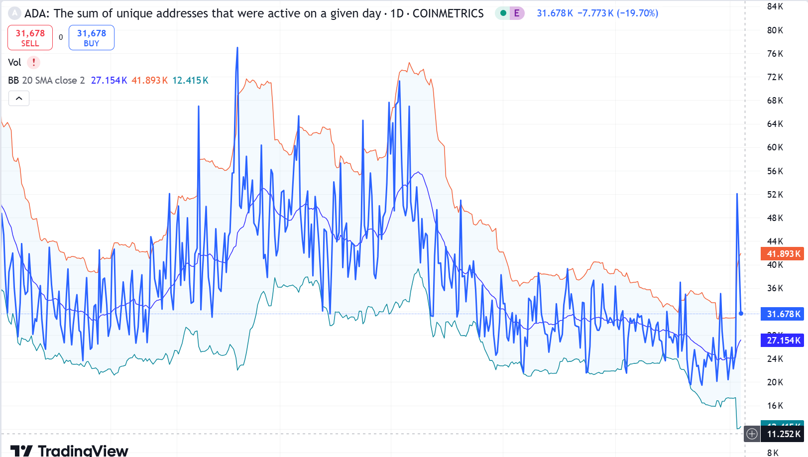 Cardano hat einige ermutigende Anzeichen im On-Chain-Markt gesehen. Die Zahl der aktiven Adressen stieg auf 31.678 – ein 5-Monats-Hoch. Der Anstieg der Beteiligung war auf den Einsatz von ASI-Token zurückzuführen.