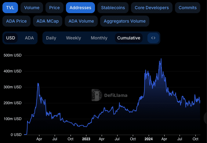 Auch Cardanos Ökosystem dezentraler Finanzdienstleistungen (DeFi) wächst. Auch das dezentrale Finanzökosystem (DeFi) von Cardano zeigt Anzeichen von Wachstum. DefiLlama-DatenDer Gesamtwert (TVL) im auf Cardano basierenden DeFi-Protokoll beträgt jetzt 218,88 Millionen US-Dollar, was einem Anstieg von 1,58 % in den letzten 24 Stunden entspricht.