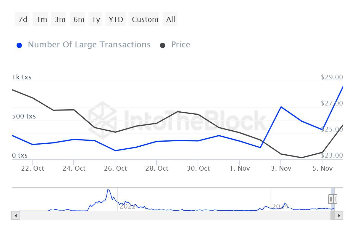 Die Analyse der On-Chain-Metriken durch AMBCrypto zeigte einige vielversprechende Signale. Zum Zeitpunkt der Erstellung dieses Artikels meldete IntoTheBlock einen deutlichen Anstieg der Walaktivität um 49 % und einen Anstieg des Handelsvolumens um 14 %.