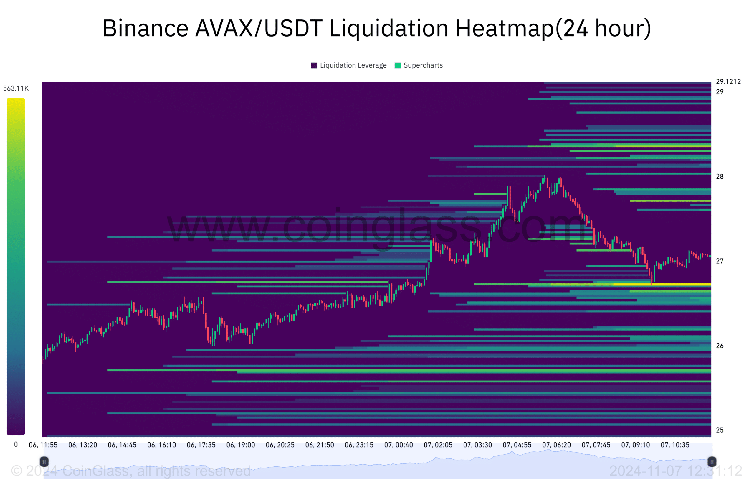 AMBCrypto analysierte die Coinglass-Daten und stellte fest, dass 563.000 AVAX bei 26,73 $ liquidiert wurden, was auf eine mögliche kurzfristige Korrektur hindeutet.