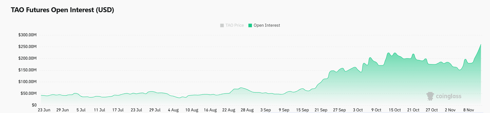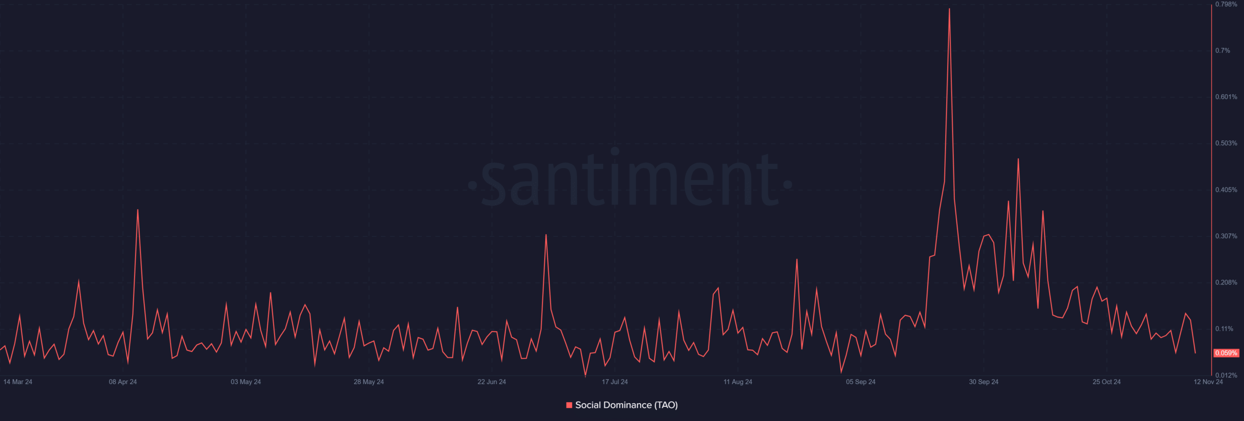 Interessant ist, dass der Grad der sozialen Dominanz, der derzeit bei 0,059 % liegt, zurückgegangen ist. Es ist möglich, dass der jüngste TAO-Preisanstieg nicht so sehr auf den Hype von Privatanlegern zurückzuführen ist, sondern eher auf größere Anleger, was den Aufwärtstrend hätte stabilisieren können.