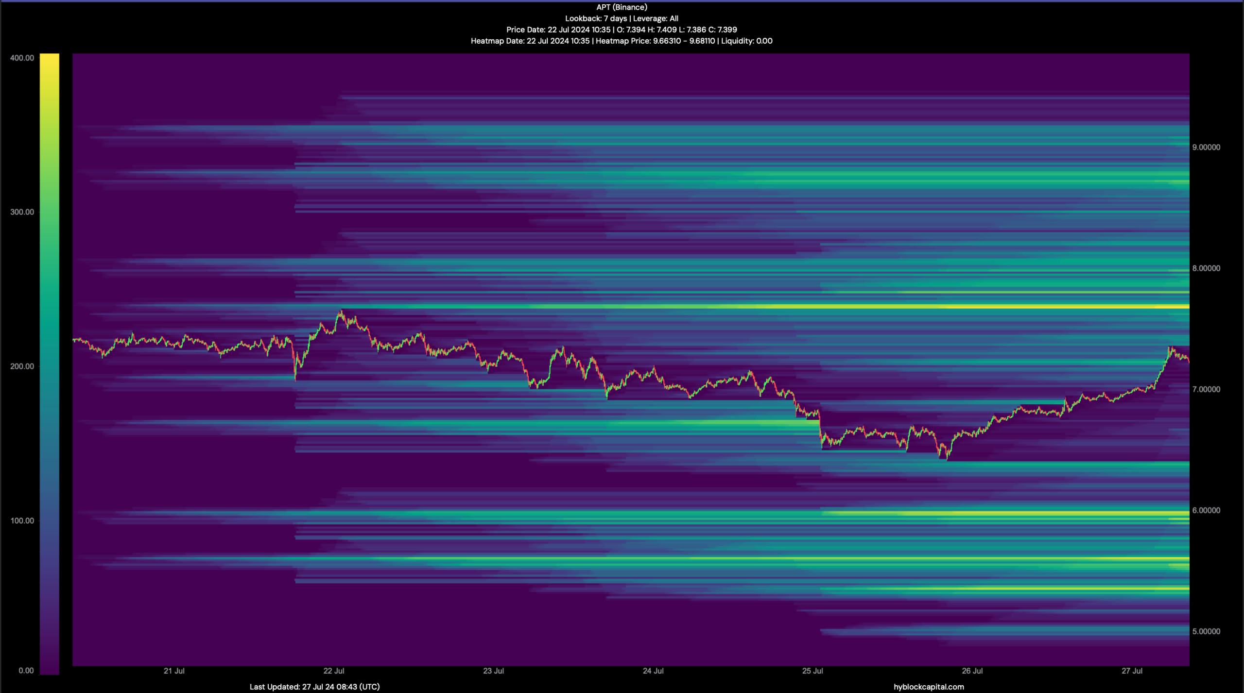 Ein Durchbruch über dieses Niveau könnte Aptos bis auf 8,7 USD bringen. Dies schien der Fall zu sein, da die Liquidationen auf diesem Niveau zu steigen schienen. Dies führt normalerweise zu einer kurzfristigen Preiskorrektur.