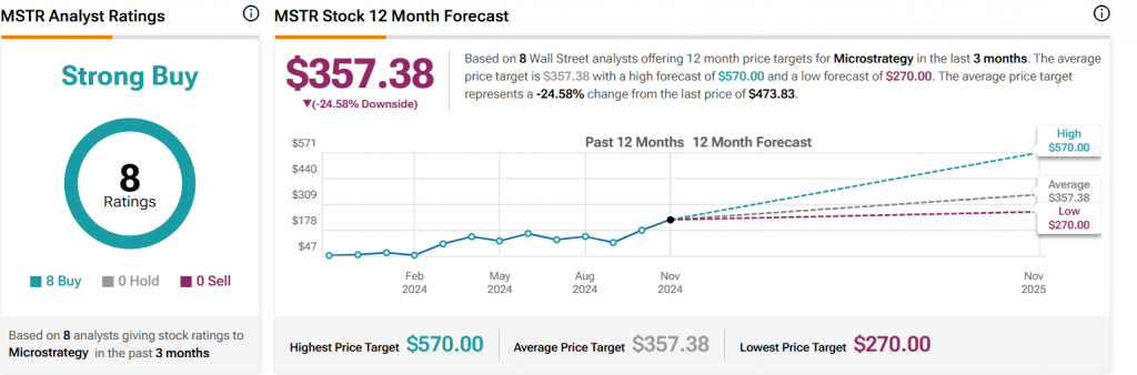 Gemäß TipRanksDas hohe Kursziel für MSTR liegt bei 570 $. Dieser Preis entspricht der Prognose von BTIG zum Aktienkurs von Microstrategy. TipRanks behauptet, dass Microstrategy im nächsten Jahr einen hohen Aktienkurs von 570 US-Dollar erreichen kann, oder früher, wenn Bitcoin 100.000 US-Dollar erreicht und der MSTR-Trend vom Markt unterstützt wird.