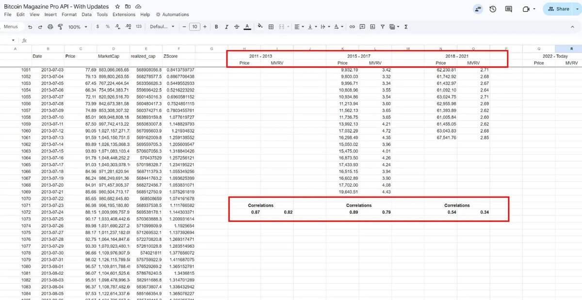 Wir nutzen die API von Bitcoin Magazine Pro, um ein tieferes Verständnis darüber zu erlangen, wie dieser Zyklus im Vergleich zu den vorherigen Zyklen abschneidet. Im Genesis-Zyklus ist der Zusammenhang weniger ausgeprägt. Indem man es ausschließt und nur MVRV- und Preisdaten zwischen den niedrigen Schlusskursen von Bitcoin und seinen Höhepunkten während unseres aktuellen und drei vorherigen Zyklen vergleicht, gibt es klare Korrelationen.