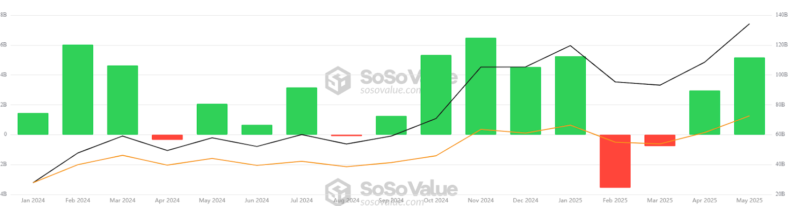 Während die USA ein Ort sind Bitcoin -ETFs sind CoinTelegraph, 23. Mai, berichtete, dass der Rekord -monatliche Zufluss von 6,49 Milliarden US -Dollar ab November 2024 nur 1,3 Milliarden US -Dollar entfernt beträgt.