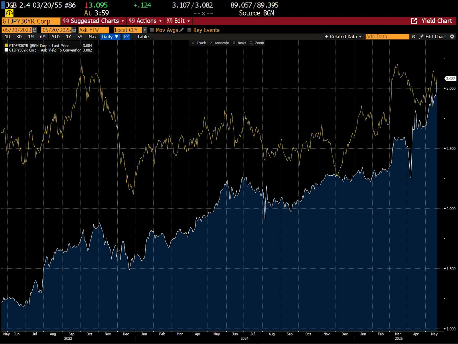Staatsanleihen gelten im Allgemeinen als sichere Haveninvestitionen. Anleger sind oft besorgt über Rückzahlung und fiskalisches Risiko, wenn die Erträge der staatlichen Anleihen steigen. Japans BIP-zu-DEBT-Verhältnis ist 250% höher als die Deutschlands, aber beide hatten im Mai Anleihenerträge von rund 3,1%. notiert Die Kobeissi -Nachricht