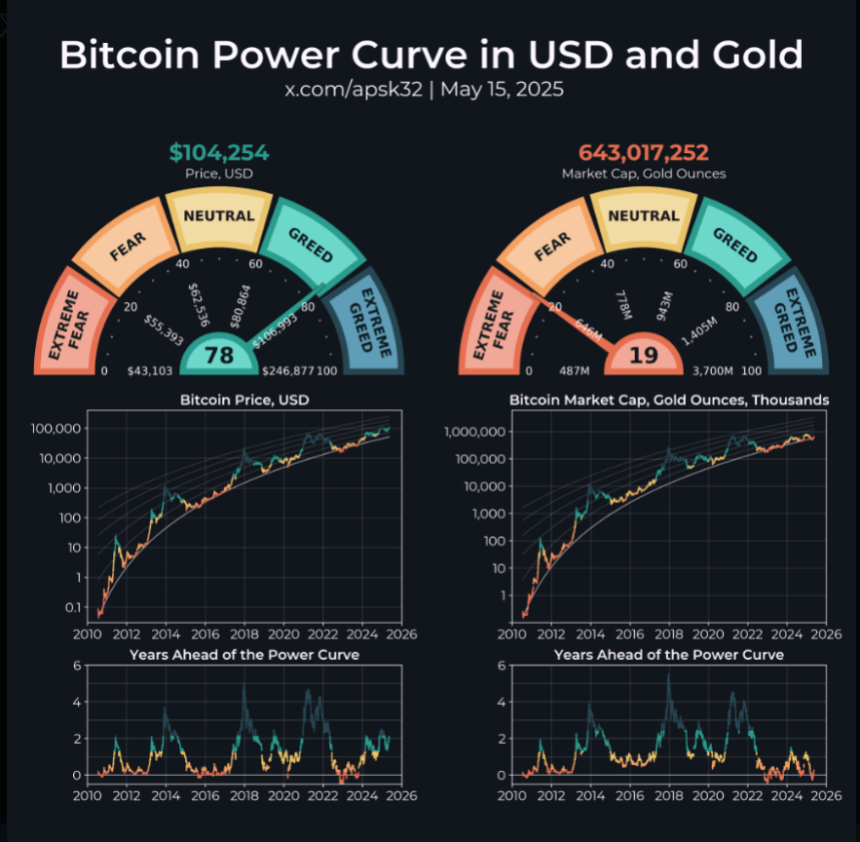 APSK32 ruft ein, was er ein “Power Curve” -Tool macht. Dieses Werkzeug krümmt den Bitcoin -Wert in Gold, um eine glatte Kurve zu erstellen. Dieses Tool reicht 2017 auf ein Hoch von rund 20.000 US -Dollar. Bei der Darstellung schlägt ein 2025 Bullenmarket Peak über 200.000 US -Dollar vor. Er sagte zu X: “Wenn sich die Position von Bitcoin in Bezug auf Gold weiter verbessert, könnten die Renditen die Erwartungen übertreffen.”