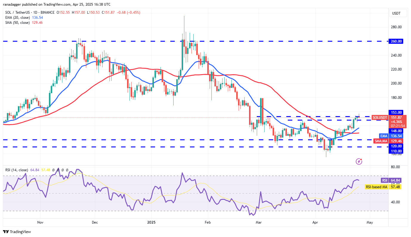 Die upsloping 20-tägigen EMA (136 US-Dollar) und die RSI in der positiven Zone zeigen, dass die Bullen die Kontrolle haben. Wenn Käufer den Preis über 153 US -Dollar drücken und beibehalten, könnte das Sol/USDT -Paar auf 180 US -Dollar steigen.