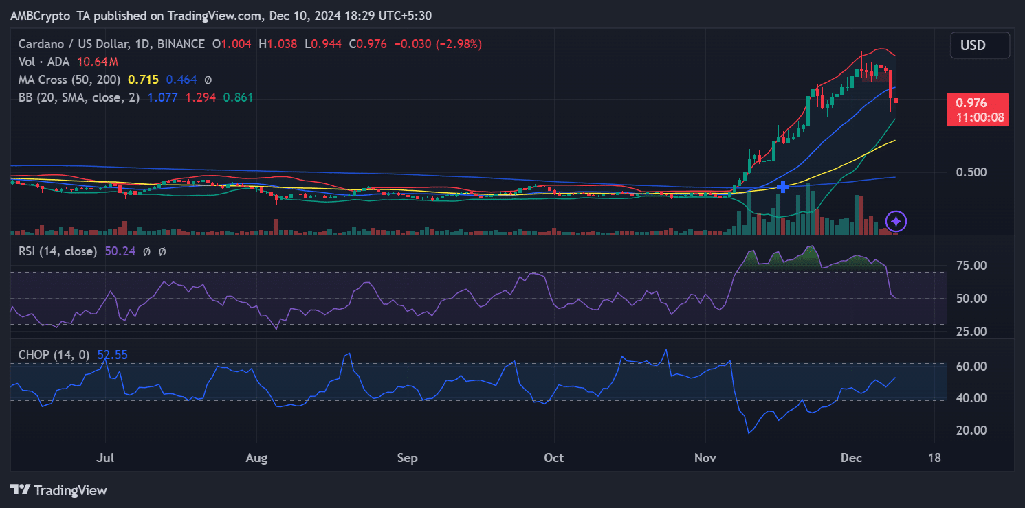 AMBCrypto analysierte das Preisdiagramm und stellte fest, dass ADA zum Zeitpunkt dieses Schreibens für etwa 0,97 US-Dollar gehandelt wurde.