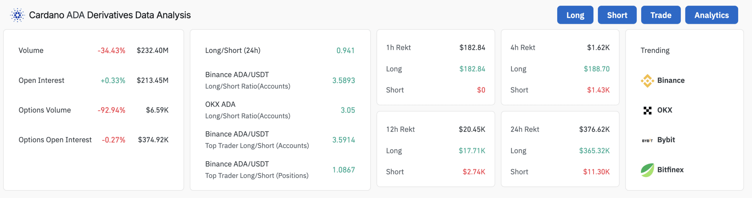 Die Daten zu Derivaten lieferten für ADA ein gemischtes Bild. Das Verhältnis von lang zu kurz über 24 Stunden betrug 0,941, was auf ein insgesamt ausgeglichenes Gefühl hinweist.
