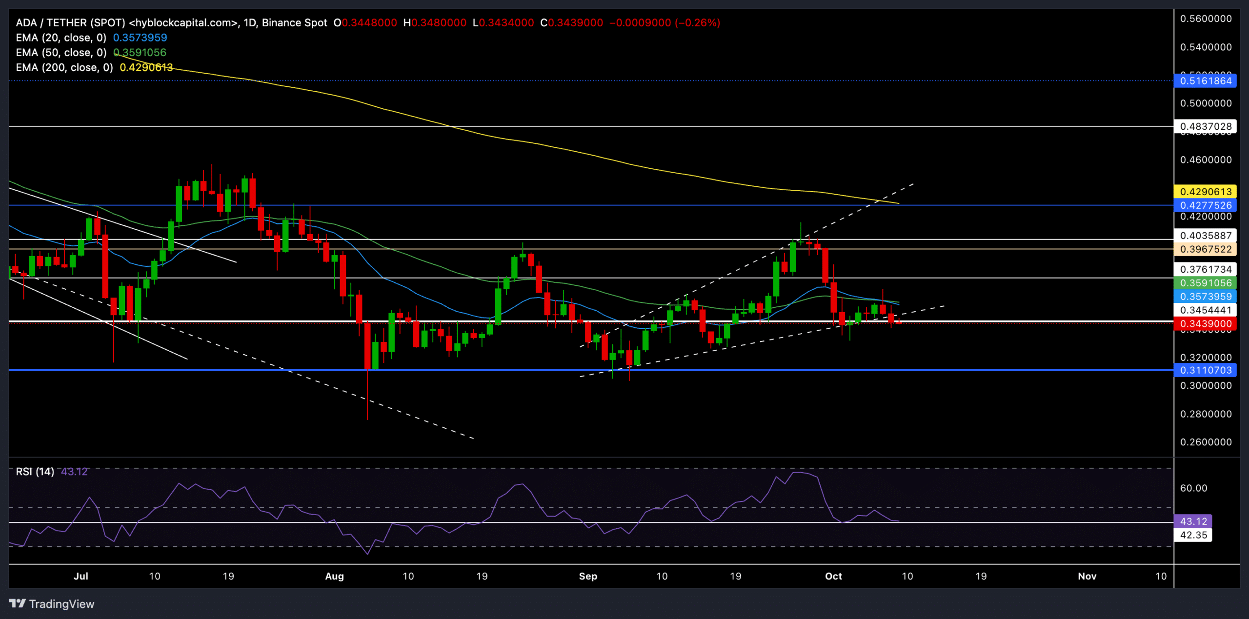Nach dem jüngsten Rückgang hatte ADA Mühe, sich über den kritischen Unterstützungsniveaus zu behaupten. Zum Zeitpunkt der Drucklegung lag der Transaktionspreis bei rund 0,3439 US-Dollar. Das ist ein Rückgang um 2,5 % innerhalb von 24 Stunden.