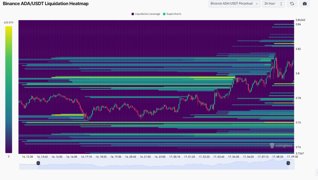 In der Reihenfolge zeigte die ADA -Wärmemap von Liquidationen eine Transaktionskonzentration von 0,80 USD und 0,82 USD, was darauf hinweist, dass eine große Anzahl von Händlern in diesem Bereich positioniert ist.