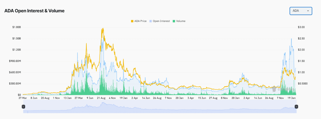 Das offene Interesse von ADA und seinem Volumen weisen darauf hin, dass mehr Händler in den Markt eingetreten sind, um Positionen auf dem Vermögenswert einzunehmen. Dies zeigt das Vertrauen in Preisbewegungen an.