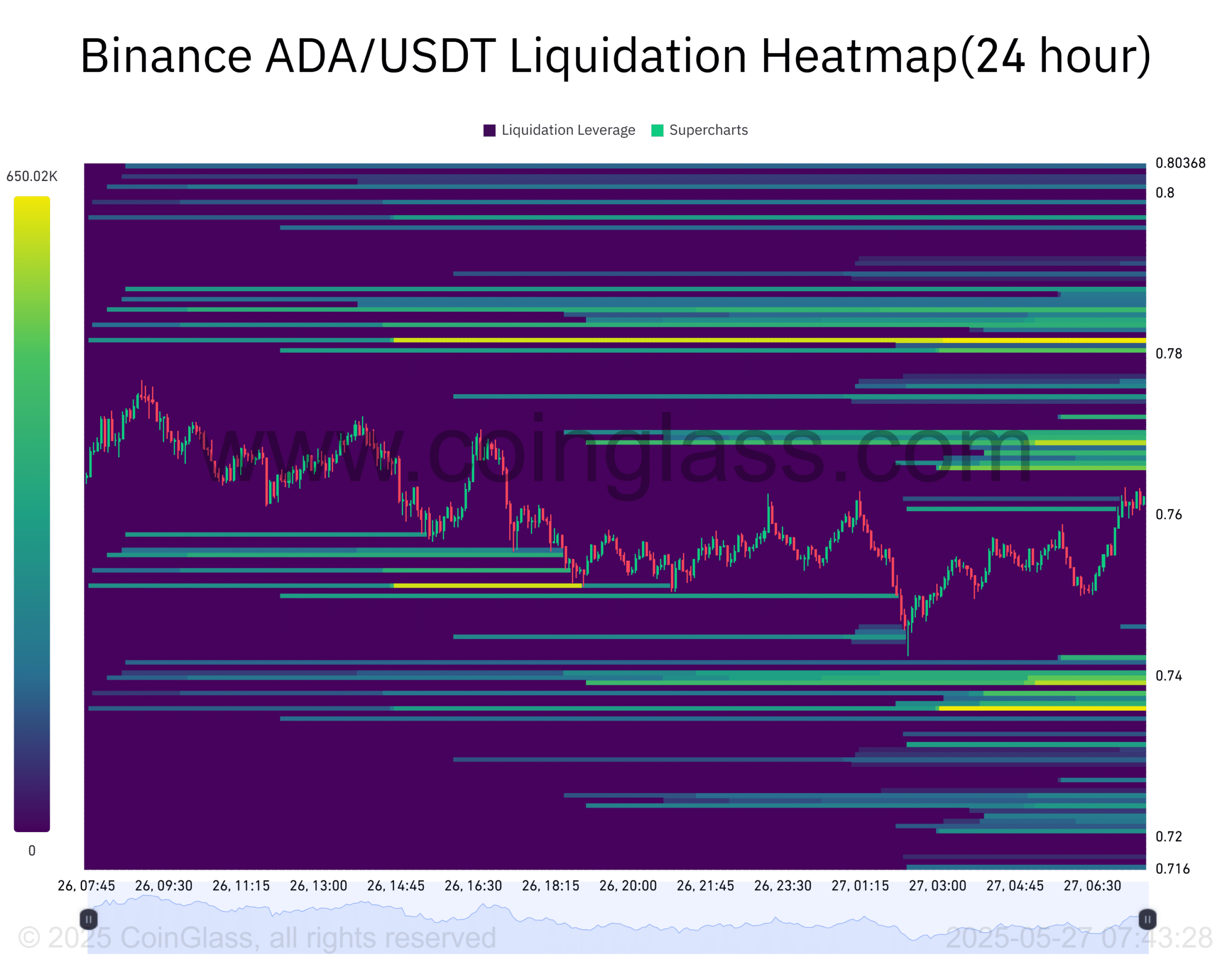 Schließlich ergab die Liquidation des Altcoin -Liquidations -Wärmemaps, dass ADA zwischen zwei signifikanten Liquiditätsniveaus auf dem Diagramm steckte – etwa 0,78 USD und 0,74 USD.