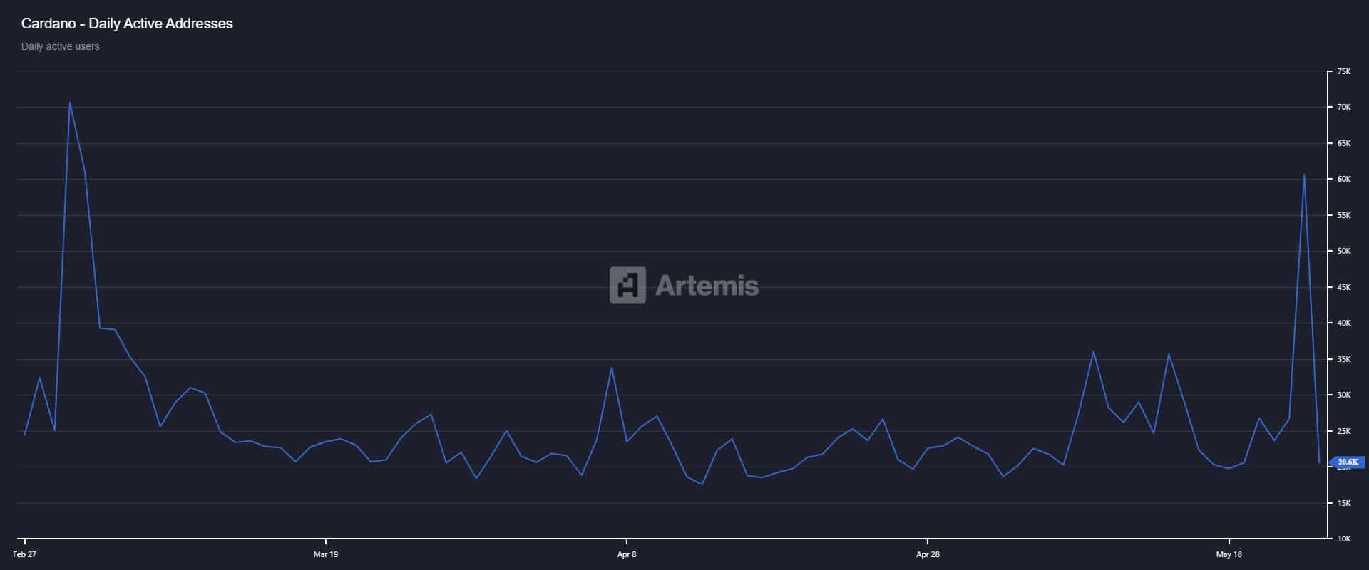 Laut Artemis hat die Anzahl aktiver Adressen – repräsentierende aktive Investoren – in den Charts um 40.000 zurückgegangen.