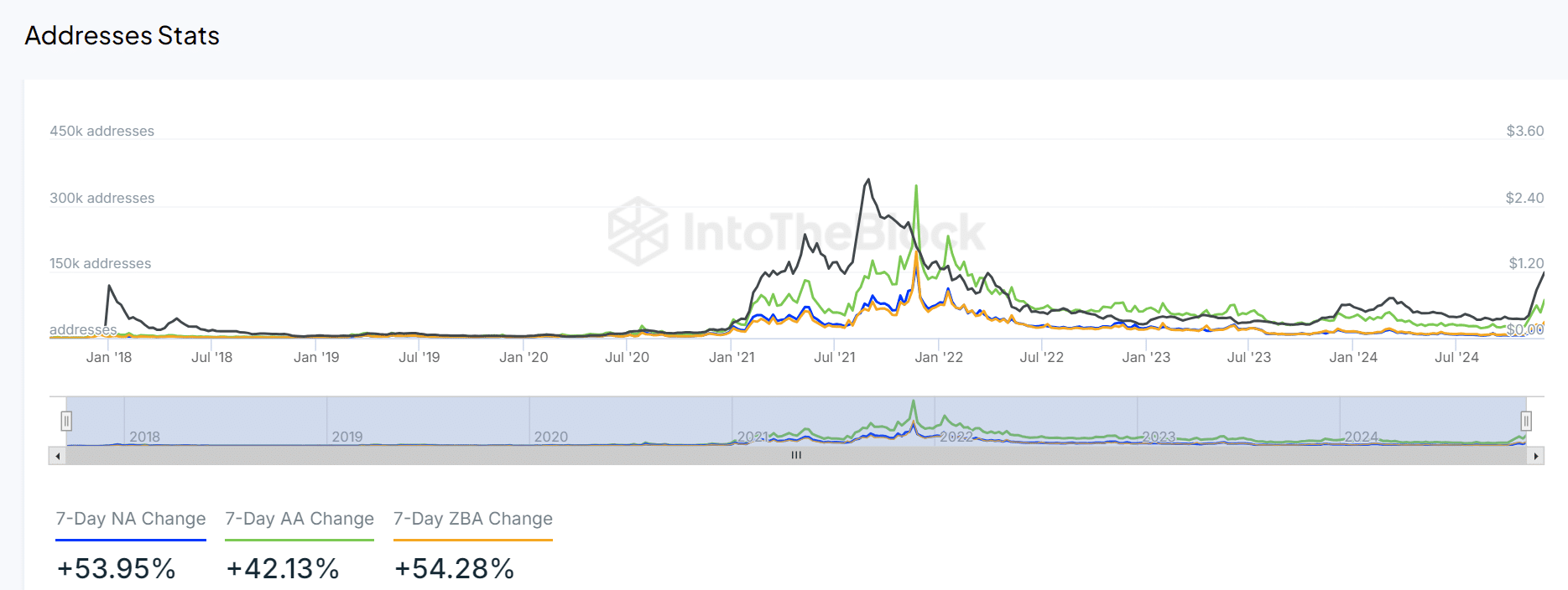 Außerdem ist die Zahl der Zero-Balanced-Adressen um 54,28 % gestiegen. Dies spiegelt die Zunahme neuer Teilnehmer am Cardano-Ökosystem wider. Diese Daten zeigen, dass das Ökosystem von Cardano wächst und Preisbewegungen unterstützen könnte.