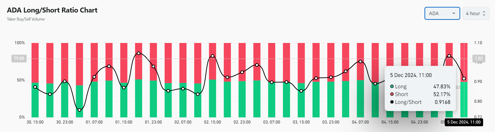 Der Long/Short-Wert beträgt 0,92. Dies deutet darauf hin, dass der Markt möglicherweise eine negative Stimmung hat. Dies könnte auf einen möglichen Short Squeeze hinweisen, wenn Cardano die Widerstandsniveaus überschreitet.