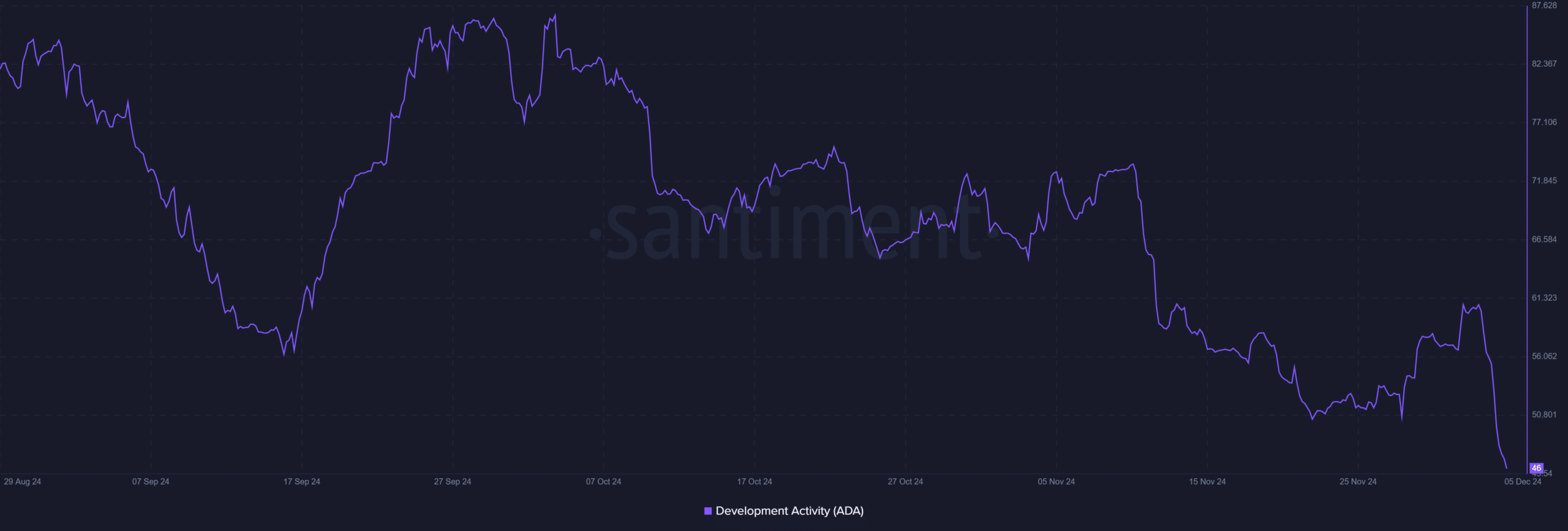 Cardano hat trotz seiner positiven On-Chain-Aktivitäten einen relativ niedrigen Entwicklungswert von 46. Es könnte sein, dass das Wachstum des Netzwerks mit einer langsameren Entwicklung einhergeht.