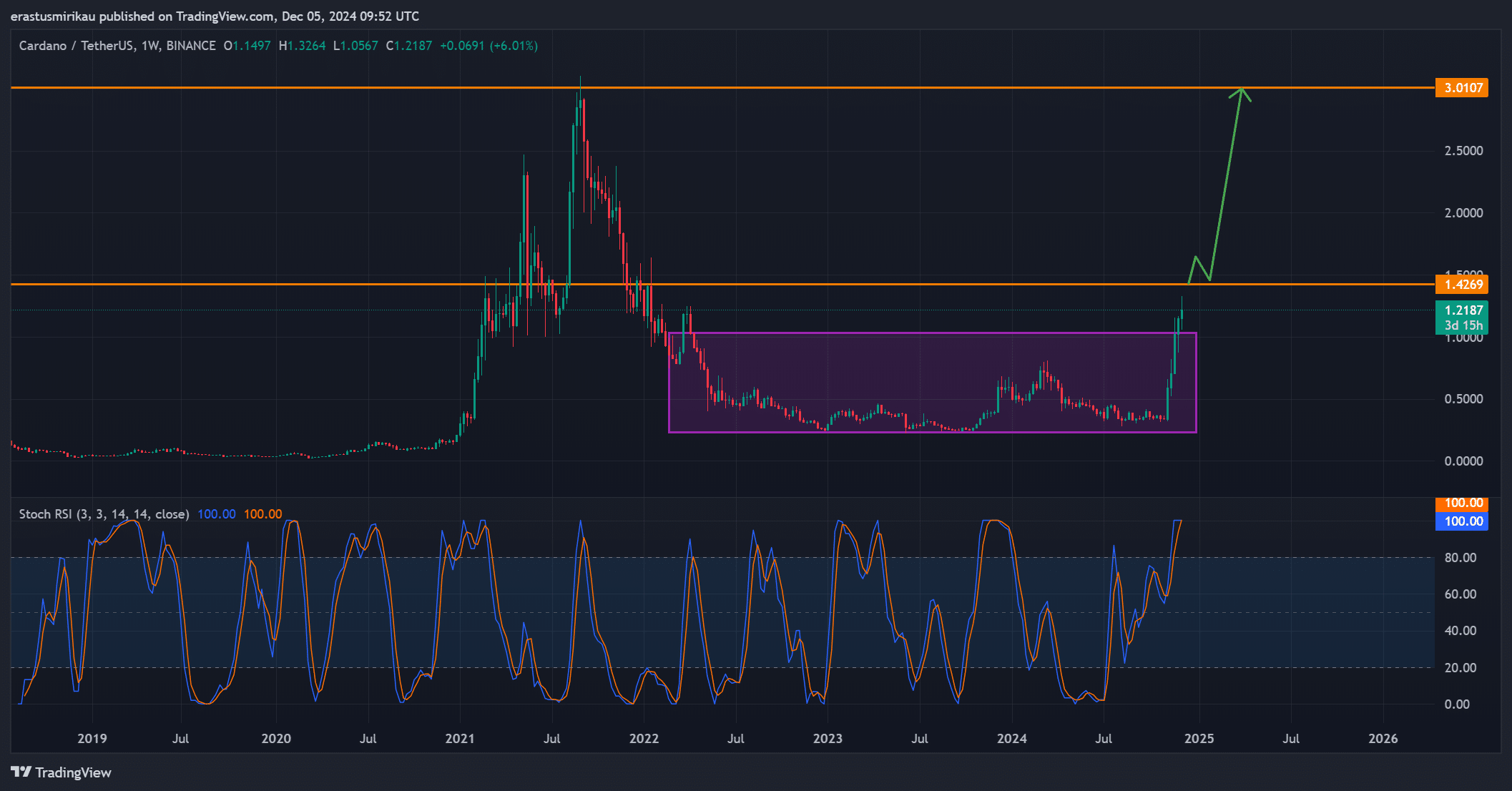 Wenn ADA dieses Ziel übertreffen kann, könnte es bis zu 3.000,00 $ erreichen. Der stochastische RSI liegt bei 100 und signalisiert einen starken Aufwärtstrend, der den überkauften Status von ADA bestätigt.