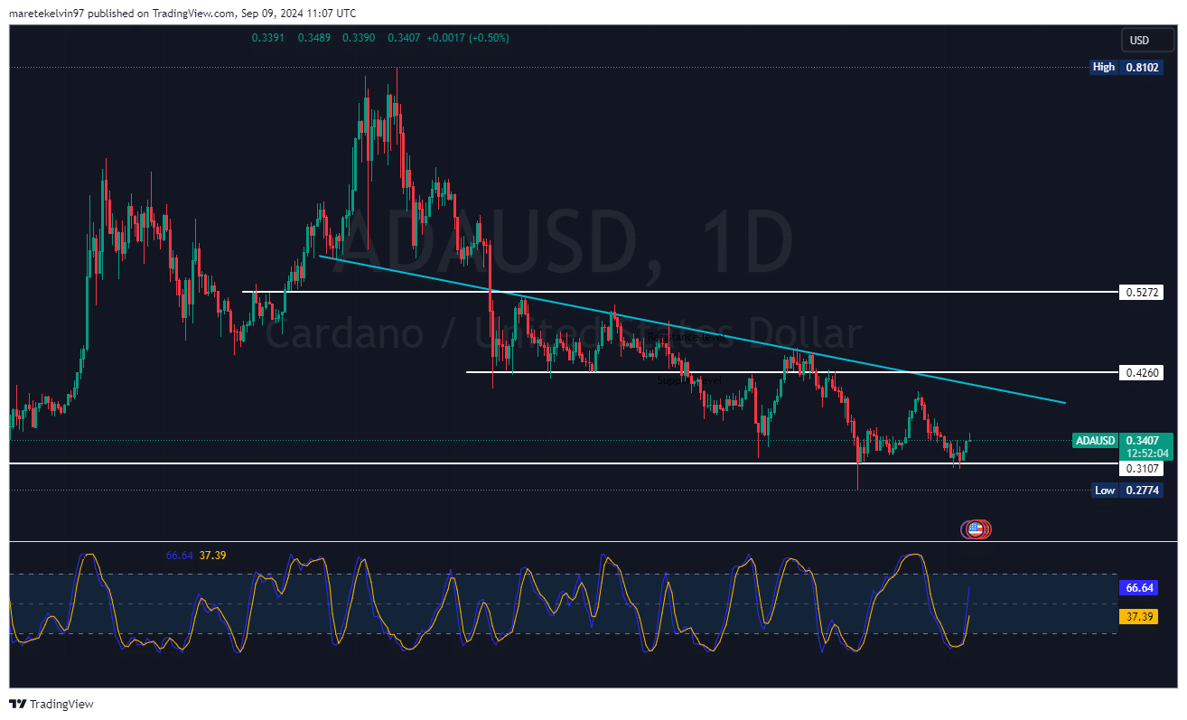 ADA befindet sich derzeit auf einer Abwärtstrendlinie, die bis Anfang 2024 zurückreicht.