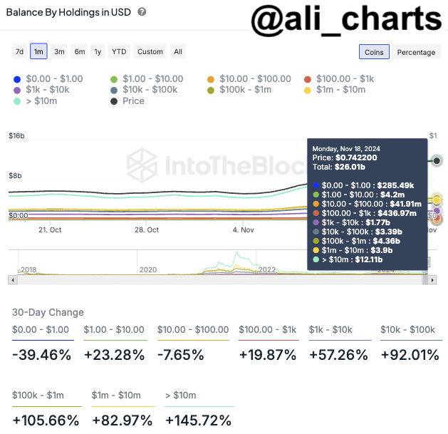 Analysten haben einen deutlichen Anstieg des „Balance By Holding in USD“ festgestellt. Dieser Tracker verfolgt ADA über alle Wallet-Guthaben hinweg. Der Anstieg war auf eine große Anhäufung von ADA durch die größten Inhaber zurückzuführen.