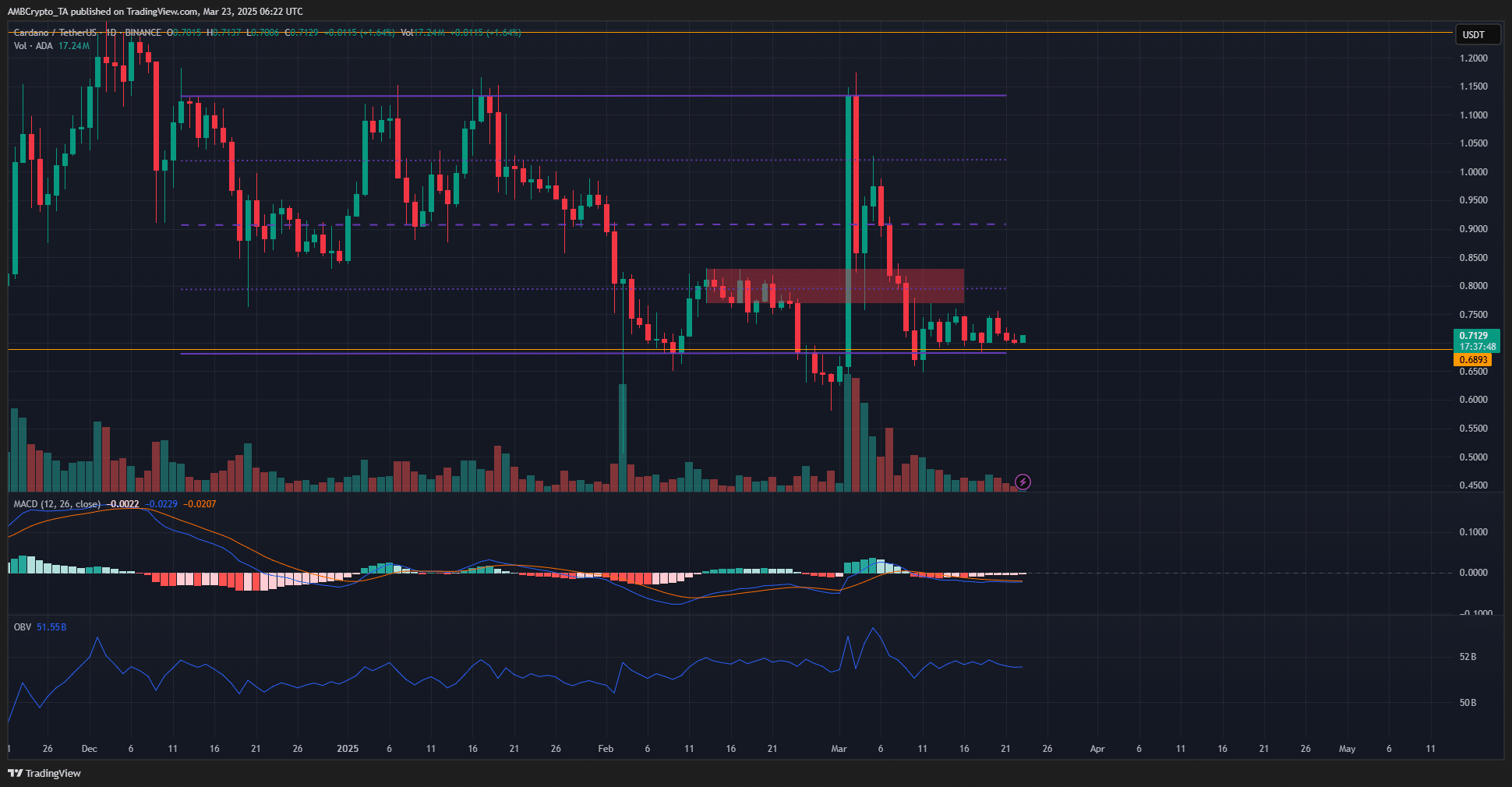 Cardano schien mit seiner Genesung zu kämpfen und über den Widerstand von 0,8 US -Dollar hinaus zu bewegen. Ein mangelnder Aktivität sowohl auf dem Spot -Markt als auch auf dem Derivatemarkt war auf eine bärische Stimmung hinweist.