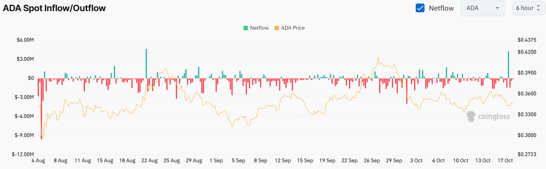Die Daten von Coinglass zeigen, dass ADA-Händler verkaufen. Kürzlich erreichten die Spotzuflüsse 4,28 Millionen US-Dollar – den höchsten Stand seit Mitte August. Die Tatsache, dass die Kassazuflüsse den höchsten Stand seit Mitte August erreicht haben, deutet darauf hin, dass Händler Münzen zum Verkauf an Börsen transferiert haben.