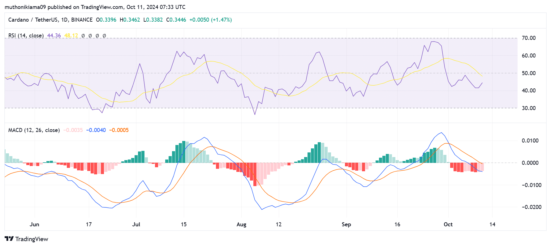 Ein Blick auf den Chart für einen Tag zeigte, dass sich der Abwärtstrend fortsetzen könnte. Cardano hat ein Kopf-Schulter-Muster gebildet, was darauf hindeutet, dass es in einen Abwärtstrend eintreten könnte. Diagrammmuster, das die Beziehung zwischen zeigt Rallye ADA hat sich seit Ende September abgeschwächt, als es um mehr als 26 % zulegte. Marktbären könnten mit dem Verkauf beginnen, was zu einem Rückgang der Preisdiagramme führen würde.