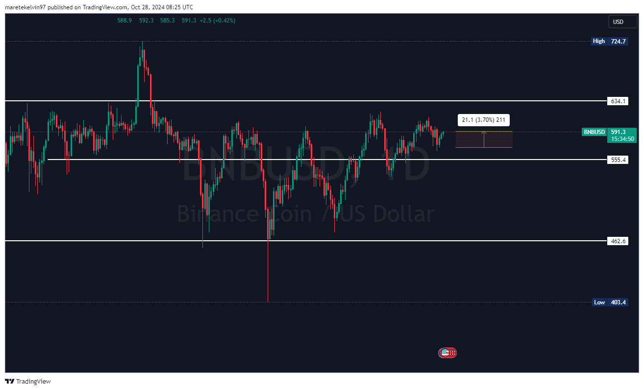 Das starke Unterstützungsniveau bei 555,4 US-Dollar kann jedoch eine klar definierte Handelsspanne schaffen. Das bullische Momentum der BNB nimmt zu und die Widerstandsmarke von 634 $ ist nun zum Ziel für die Bullen geworden.