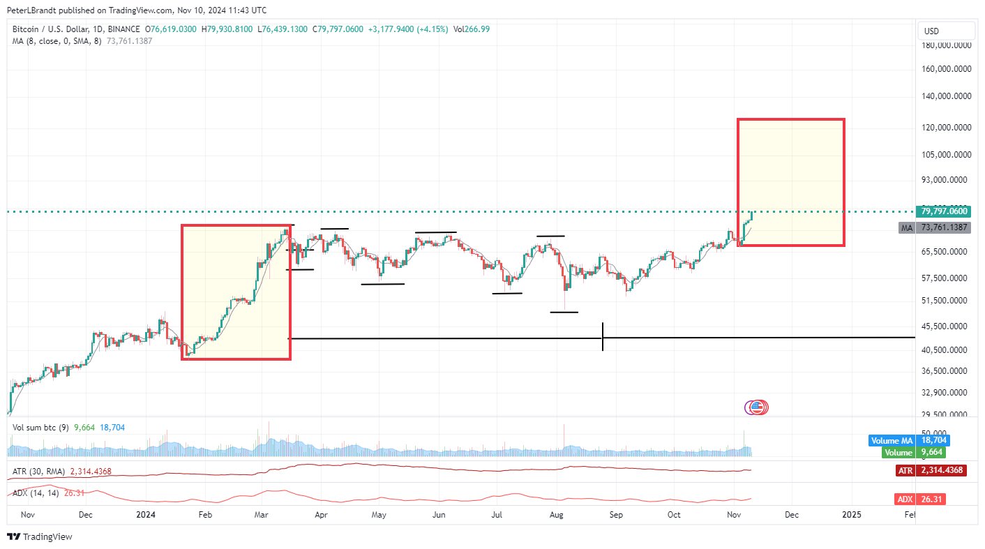 BTC/USD-Eintagesdiagramm. Quelle: Peter Brandt/X