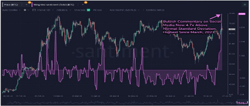 Santiment, eine Crypto-on-Chain-Plattform, die Marktinformationen bereitstellt, stellte fest, dass die optimistische Haltung gegenüber Bitcoin unter den Teilnehmern nun ihren höchsten Stand erreicht hat. Die Daten von Santiment zeigen, dass das Verhältnis zwischen positiven und negativen Kommentaren zu BTC in sozialen Medien auf dem höchsten Stand seit dem 20. März 2023 ist. Die Anleger sind zuversichtlicher, dass ein Allzeithoch erreicht wird.