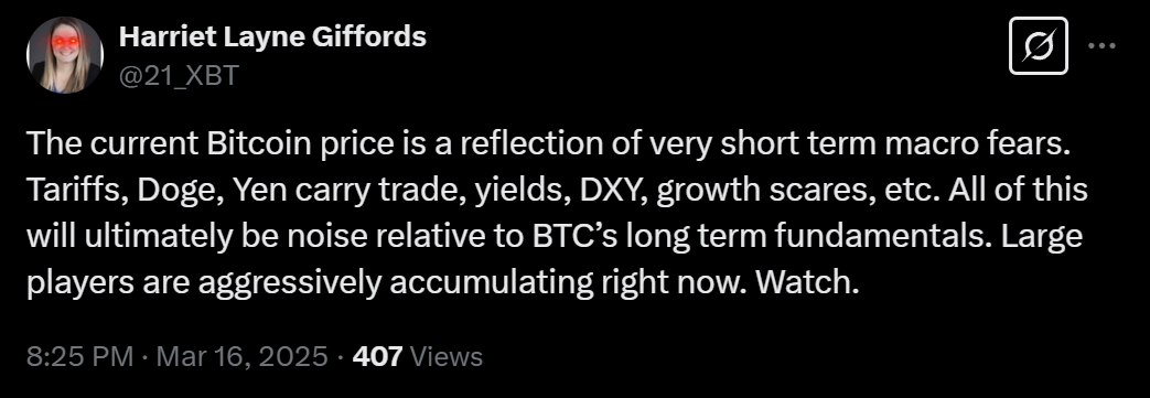 Obwohl die Bitts -Bemerkungen bei Bitcoin optimistisch sind, dauerte es einige Zeit, bis sich die Vorteile der früheren US -Dollar -Schwäche manifestieren. Tatsächlich könnten sie in bestimmten Fällen bis zu zwei Jahre dauern. Die Underperformance von Bitcoin kann teilweise auf „kurzfristige Makro-Ängste“ zurückzuführen sein, so @21_xbt,