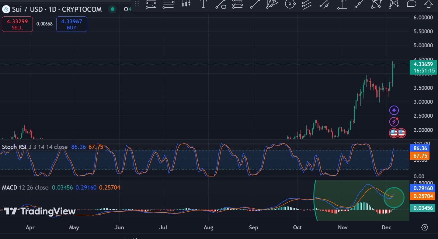 Gestern, Sui [SUI] Der Preis ist deutlich gestiegen und hat ein Allzeithoch von 4,43 US-Dollar erreicht. Der Preis ist im Diagramm um fast 25 % gestiegen.