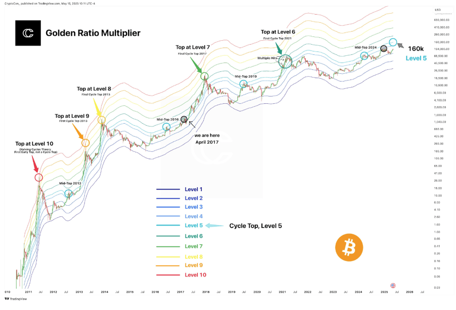 Wenn der Markt diesem Muster weiterhin folgt, kann Bitcoin später in diesem Jahr für eine eventuelle Kundgebung auf das Level 5 von 160.000 US -Dollar auf dem Level 5 ausgestattet sein. Dies könnte den letzten Hoch in diesem Zyklus darstellen. Dieser aktuelle Preisbereich von 103.000 US -Dollar könnte das endgültige Hoch für diesen Zyklus sein. Die Ruhe vor dem letzten Ausbruch. “Langsamer Aufbau, dann auf einmal”, sagte Analyst: