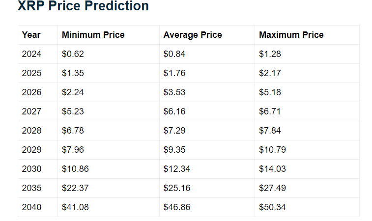 Telegaon wirft einen Blick in die Zukunft. Im Jahr 2025 schätzen sie den Wert von XRP auf 1,76 US-Dollar und im Jahr 2026 auf 3,53 US-Dollar. Sie gehen davon aus, dass XRP im Jahr 2030 12,34 US-Dollar und 25,16 US-Dollar wert sein wird. Um diese Zahlen zu erhalten, untersuchten sie historische Muster und die tatsächliche Verwendung.