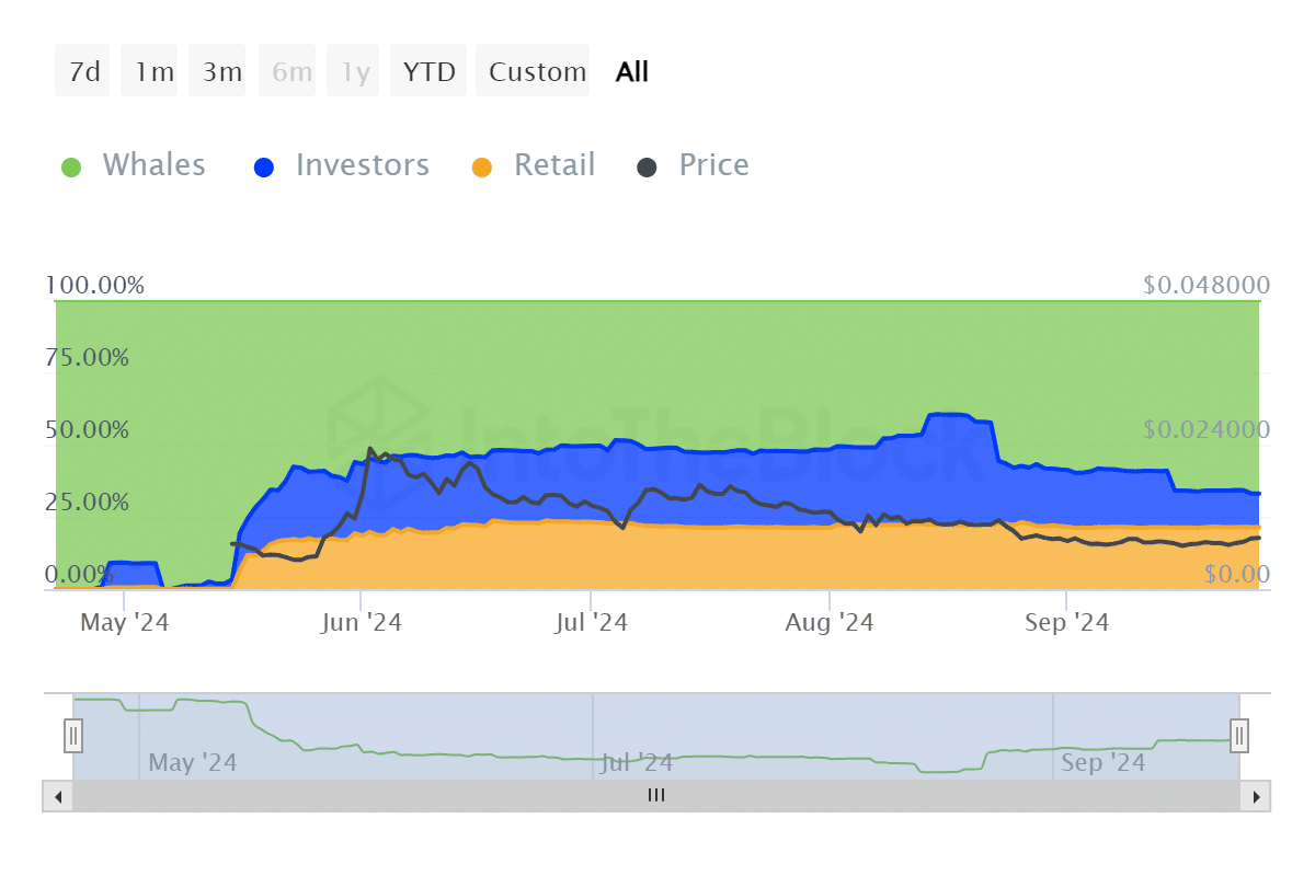 Die Daten zeigten auch, dass sich die Zahl der Wale seit Mitte August nicht wieder vermehrt hatte. Zum Zeitpunkt der Drucklegung betrug ihr Guthaben am 26. September 68,58 Billionen Münzen (66,91 %). Die Anhäufung von Münzen scheint den Rückgang von NOT zu verlangsamen.