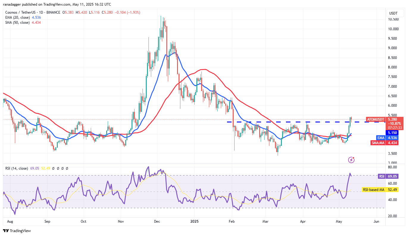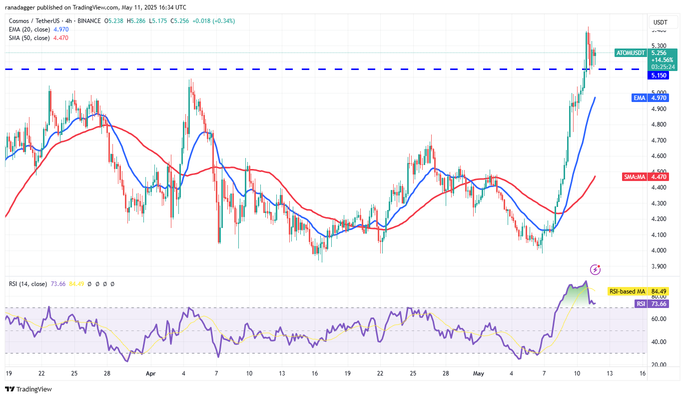 Wenn Käufer den Preis über 5,15 US -Dollar beibehalten, kann das Atom/USDT an Dynamik gewinnen und auf 6,50 USD steigen. Verkäufer können versuchen, die Aufwärtsbewegung bei 6,50 US -Dollar zu stoppen, aber wenn Bullen gewinnen, können sie das Paar auf 7,50 USD bringen.