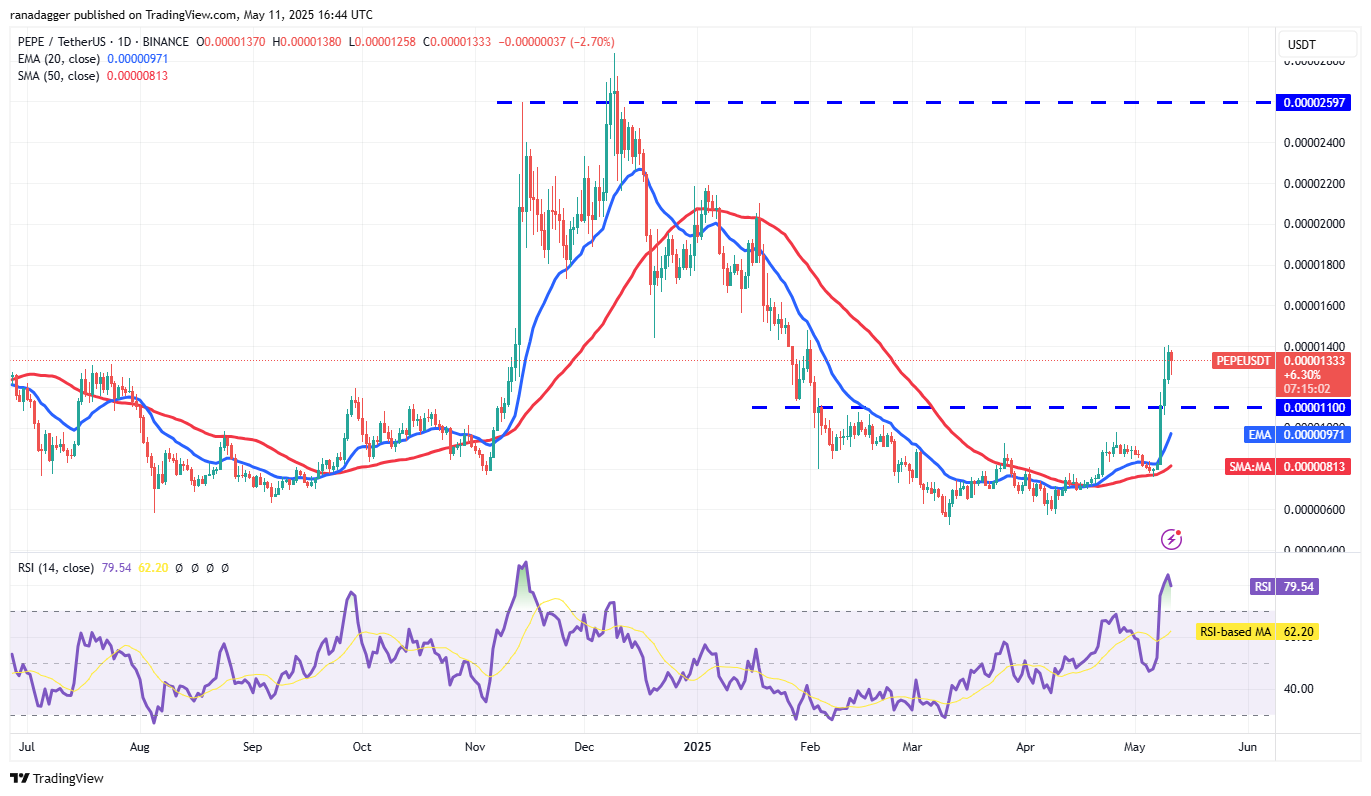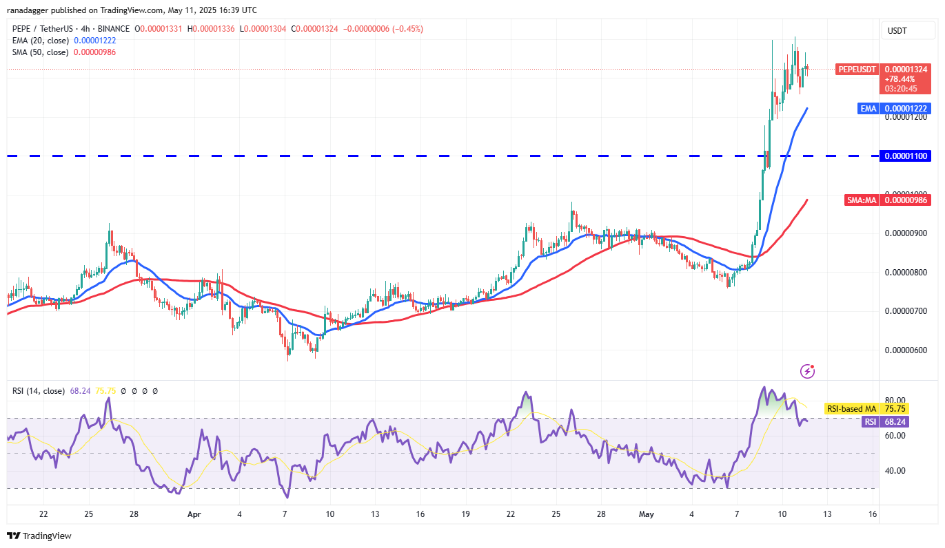 PepePepeAm 8. Mai brach eine scharfe Rallye aus dem 50 -tägigen SMA (0,000008 USD) den Widerstand von 0,00000011 US -Dollar durch.