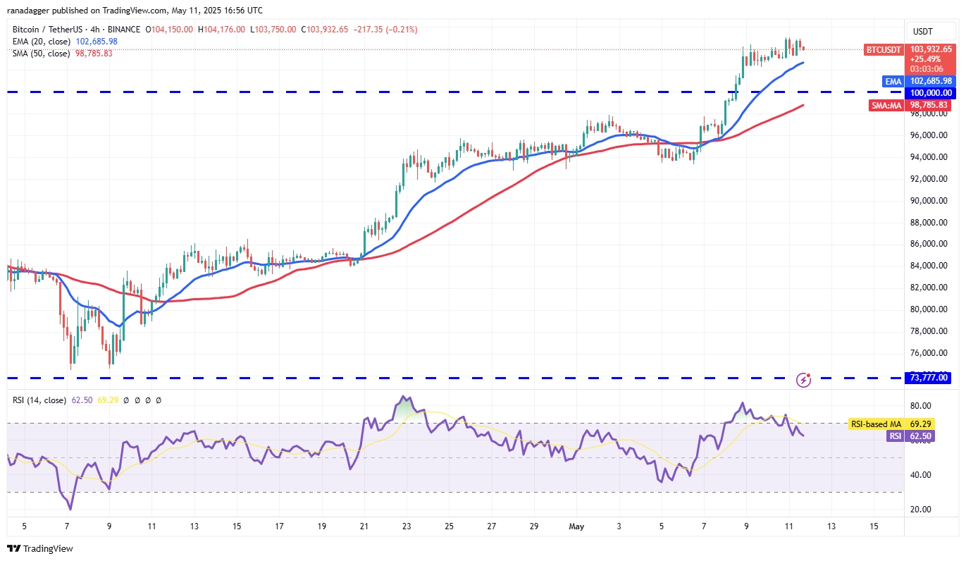Diese Rallye hat die relative Stärke (RSI), ein Maß für die Marktstimmung, in ein überkauftes Gebiet gebracht. Es deutet auf eine mögliche Korrektur oder Konsolidierung in den nächsten Wochen hin. Die Unterstützung wird wahrscheinlich zwischen 100.000 US -Dollar und dem 20 -tägigen exponentiellen gleitenden Durchschnitt (96,626) gefunden. Der Preisaufprall aus der Hilfszone erhöht die Wahrscheinlichkeit, dass es 109.588 US -Dollar verletzen wird. BTC/USDT könnte dann auf 130.000 US -Dollar steigen.