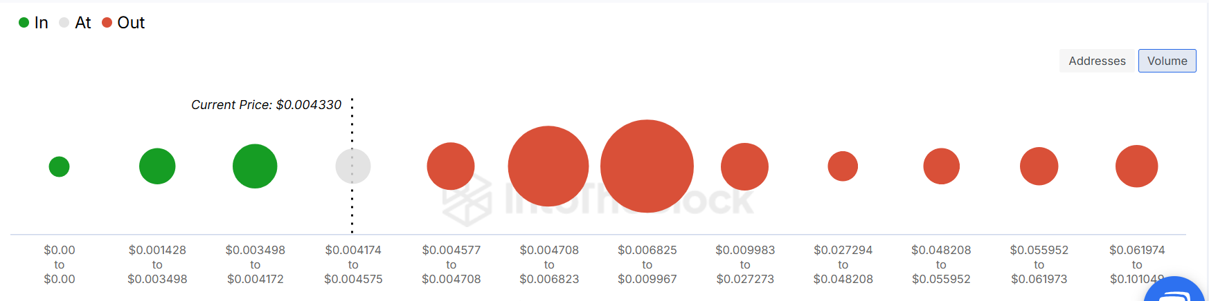 Die Daten von Santiment zeigen, dass das Handelsvolumen zunahm, nachdem ein Monatshöchstpreis von 0,0047 USD erreicht wurde. Dieses hohe Volumen stammte wahrscheinlich von Verkäufern, die den Preisverfall kurz darauf verursachten.