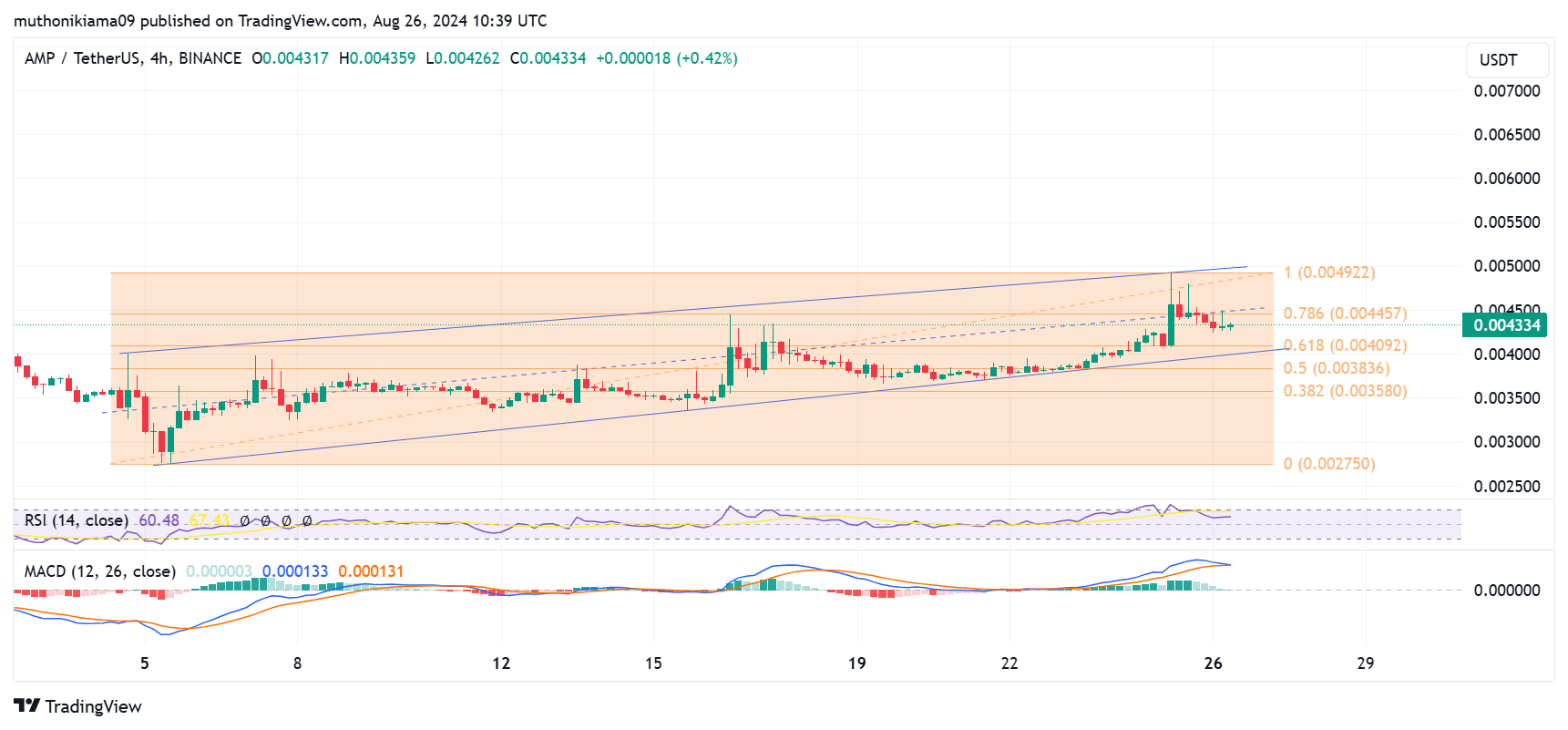 Die Kryptowährung von AMP hat seit dem 5. August einen Aufwärtskanal gebildet. Der Preis bildet höhere Hochs mit höheren Tiefs. Dieses Muster tritt häufig auf bullisch Es zeigt einen allmählichen und stetigen Aufwärtstrend.