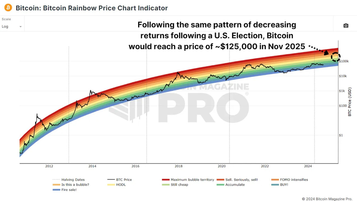 Dies ist deshalb interessant, weil jedes dieser Ereignisse zu einem Rückgang der Rendite um etwa 50 % geführt hat. Daher wären 125.000 USD für November 2025 möglicherweise ein vernünftiges Ziel, insbesondere da der Preis und die Daten mit den mittleren Bändern auf der Rainbow Preistabelle. In all diesen Zyklen verzeichnete Bitcoin sogar noch größere Zyklusspitzengewinne.