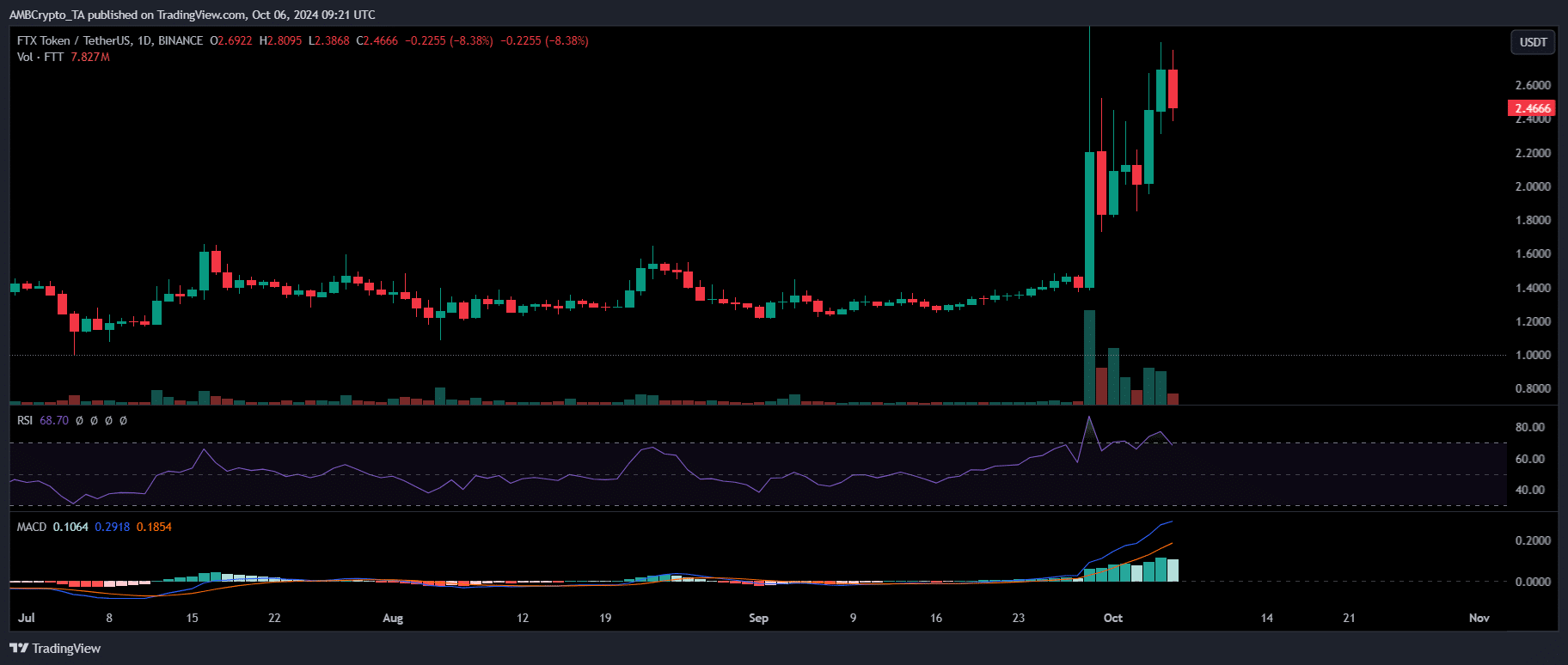 Der MACD (blaue Linie) kreuzte die orangefarbene Signallinie, was auf einen rückläufigen Crossover hindeutet. Am 4. Oktober kam es zu einem Anstieg des Handelsvolumens, der einen noch tieferen Rückgang verhinderte.