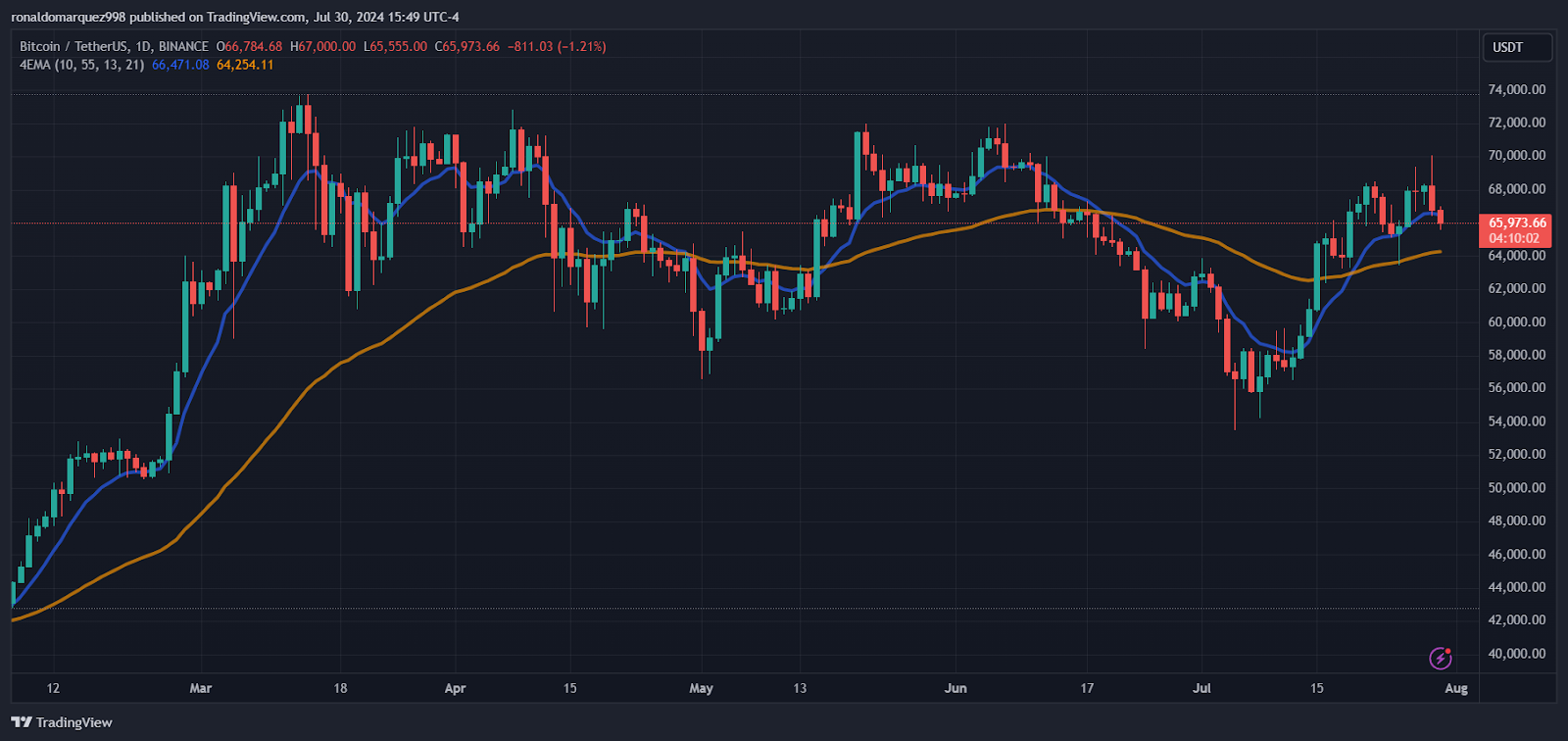 Dieses am 30. Juli 2024 veröffentlichte TradingView-Diagramm zeigt die Preisentwicklung von Bitcoin von Februar bis August.