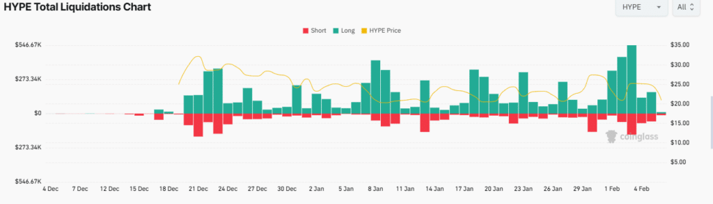 Das Diagramm der Hype -Liquidationen zeigt einen signifikanten Anstieg der Anzahl der Liquidationen in den letzten Wochen. Lange Liquidationen dominieren eindeutig kurze Liquidationen. Es ist möglich, dass gehebelte Händler mit zunehmendem Preisvolatilität gezwungen waren, ihre Positionen zu verkaufen.