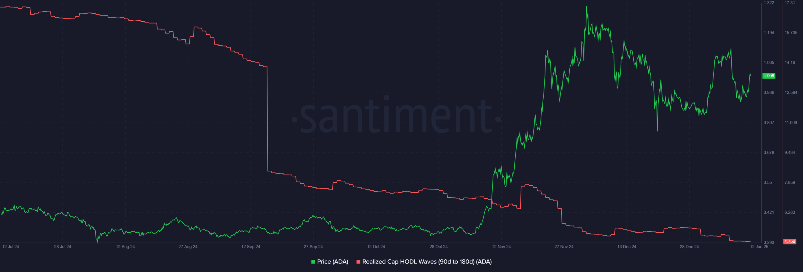Die MVRV-Long/Short-Differenz zeigte auch eine wichtige Verschiebung in der Rentabilitätsdynamik. Als der Preis von ADA über 1 US-Dollar stieg, vergrößerte sich die Differenz von MVRV, was auf eine große Divergenz der nicht realisierten Gewinne zwischen kurz- und langfristigen Inhabern hindeutet. Die MVRV-Lücke vergrößerte sich, als der ADA-Preis über 1 US-Dollar stieg, was auf eine erhebliche Divergenz bei den nicht realisierten Gewinnen zwischen langfristigen und kurzfristigen Anlegern hindeutet.