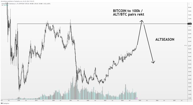 Sherpa ist auch ein beliebter Name. sagt Das Verhältnis von Bitcoin zu anderen Krypto-Assets dürfte auf einem hohen Niveau bleiben. Das Diagramm des Analysten ist weit verbreitet und es sieht so aus, als ob er vermutet, dass die Dominanz von Bitcoin 70 Prozent erreichen könnte.