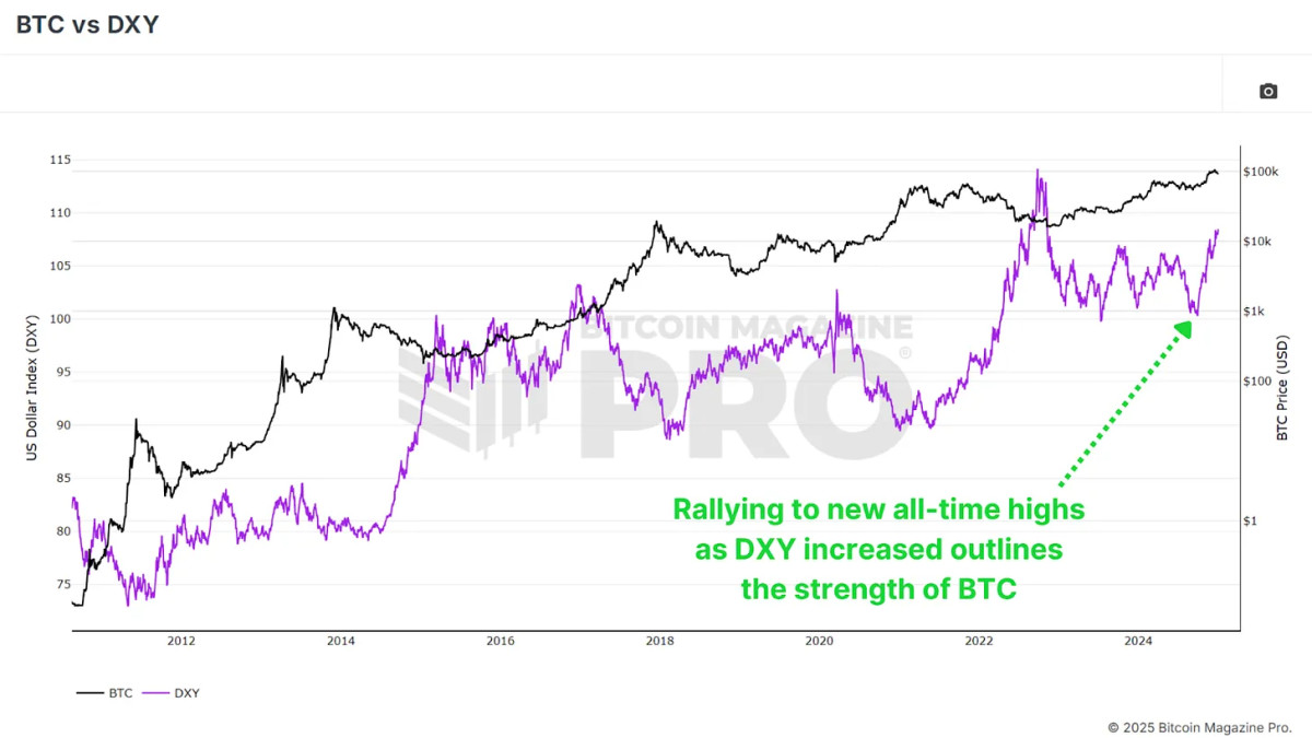 Trotz des Gegenwinds im Jahr 2024 entwickelte sich Bitcoin immer noch sehr gut. Dies trotz eines starken Dollars. US-Dollar-Index (DXY). Bitcoin und DXY haben sich in der Vergangenheit in entgegengesetzte Richtungen entwickelt, sodass jede Umkehrung des DXY den Anstieg von Bitcoin befeuern könnte.