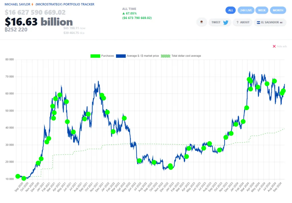 Gemäß Saylor Tracker, Das Unternehmen hat derzeit einen Gewinn von mehr als 6,8 Milliarden US-Dollar. Diese einfache Strategie, Bitcoins zu kaufen, hat ihnen dabei geholfen, diesen Punkt zu erreichen. Das Unternehmen kauft in großen Mengen ein, jedoch nur zu bestimmten Zeiten. Die Gesamtkosten von BTCs sind daher im Vergleich zum aktuellen Preis von 65.000 US-Dollar relativ niedrig.