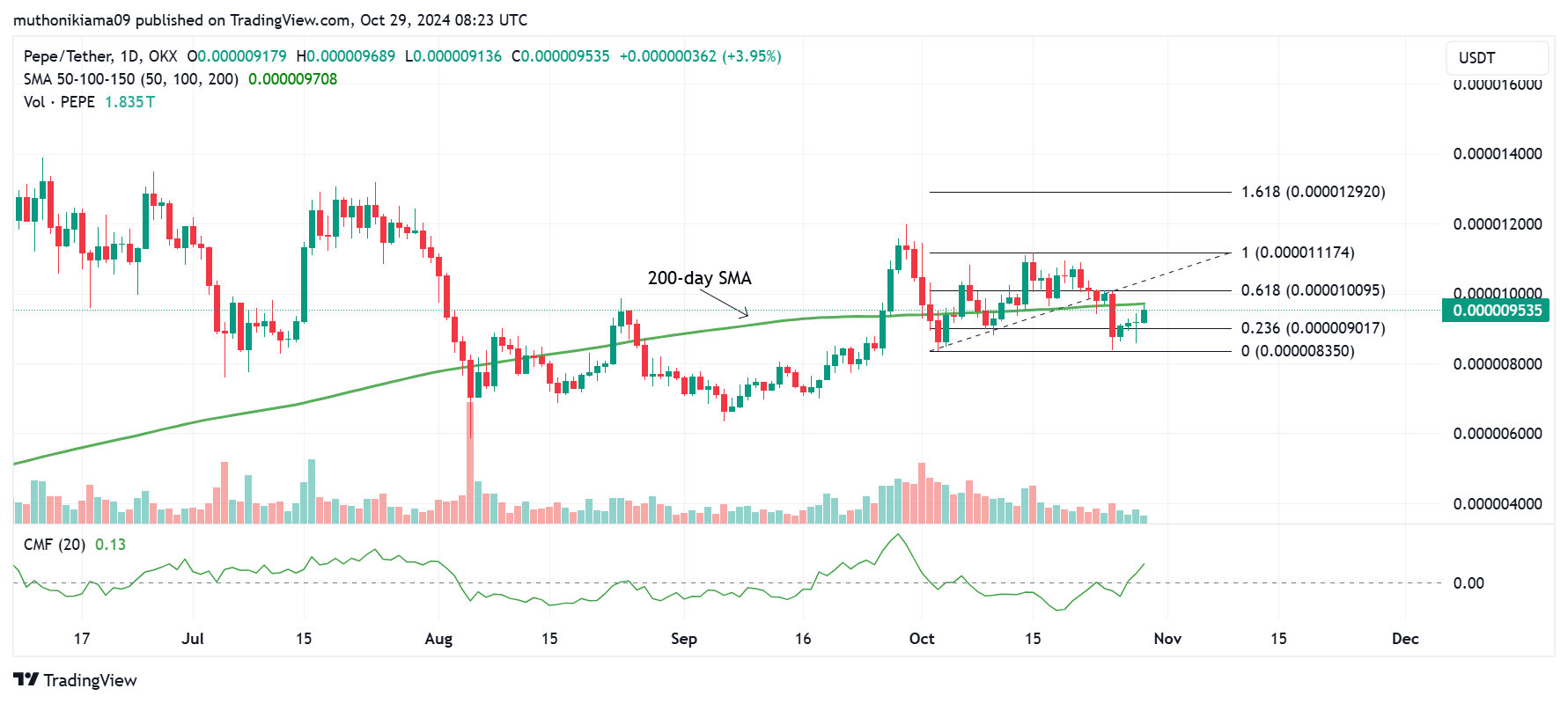 Seit Mitte Oktober notiert PEPE auf dem 1-Tages-Chart unterhalb des SMA 200, was auf einen langfristigen Abwärtstrend hindeutet. Nachdem der Preis dieses Widerstandsniveau erreicht hat, ist es möglich, dass eine Umkehr bevorsteht.